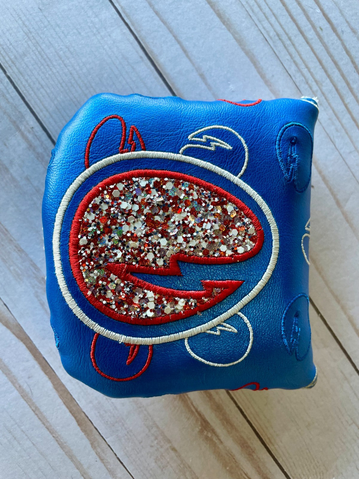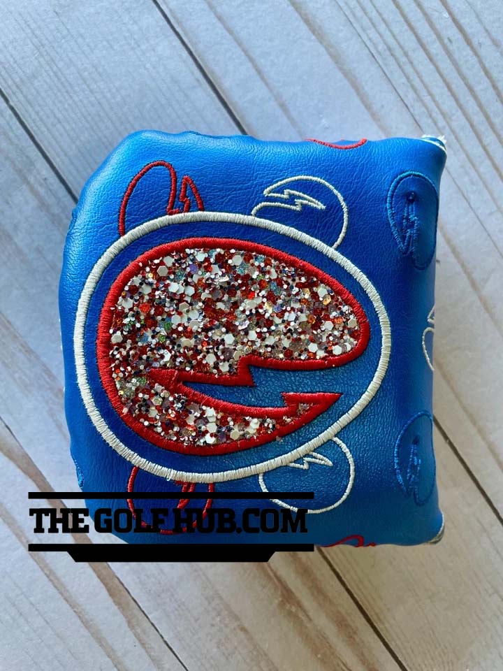 The *PRISTINE* Hatch Golf RWB Glitter Egg Mallet Head Cover is a luxurious and eye-catching accessory for golf enthusiasts. Made by Hatch Golf, this putter head cover features a magnetic closure for easy installation and removal. The blue color adds a pop of color to your golf equipment, while the unique design is sure to stand out on the course. This high-quality and stylish head cover will protect your club and add a touch of flair to your golfing experience.
