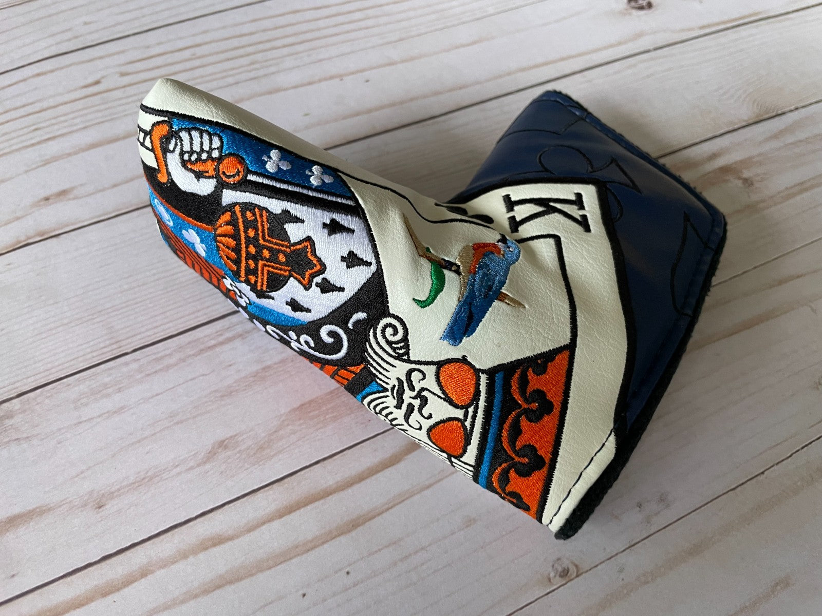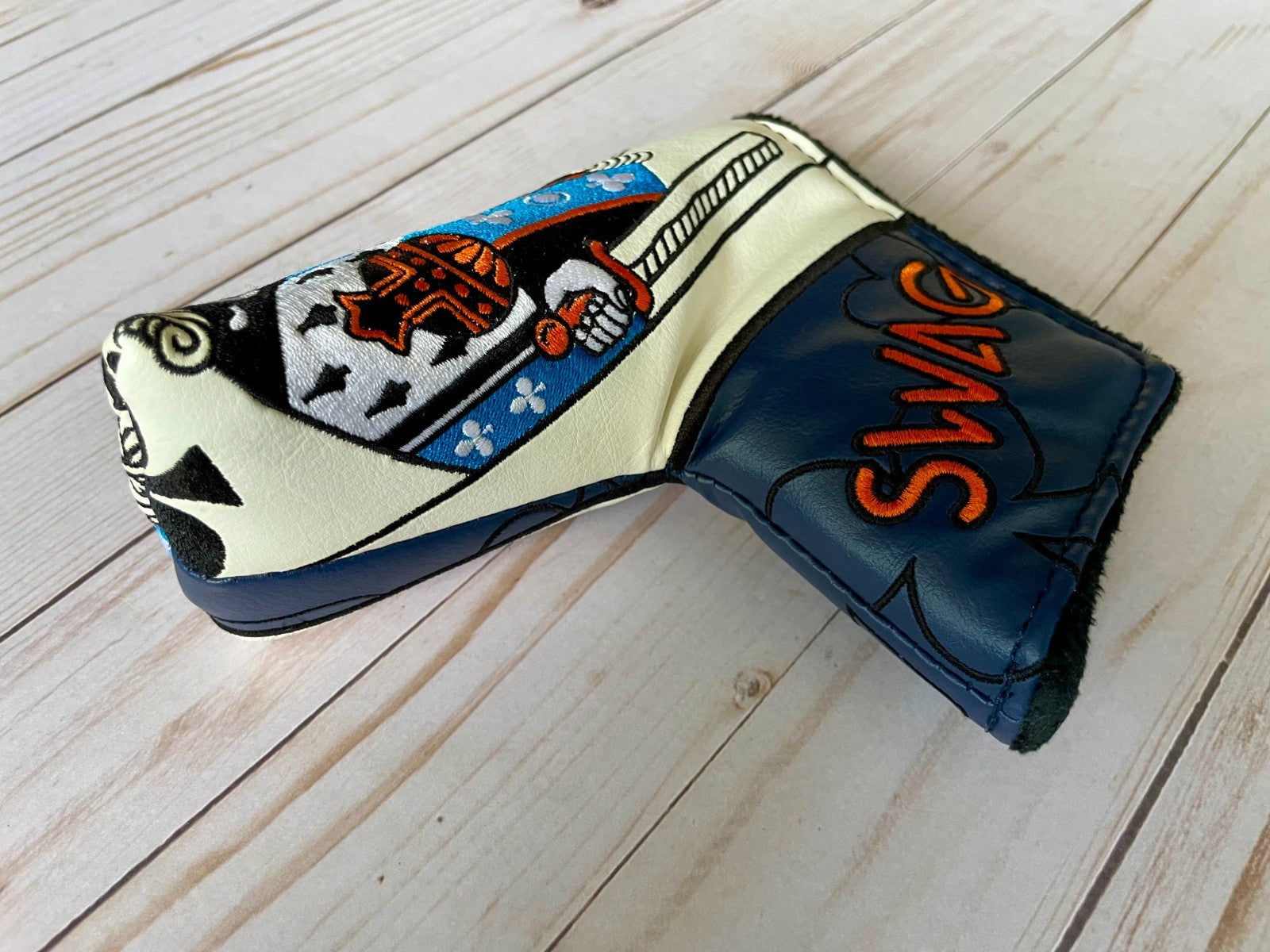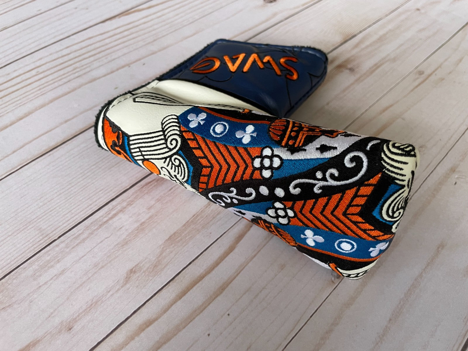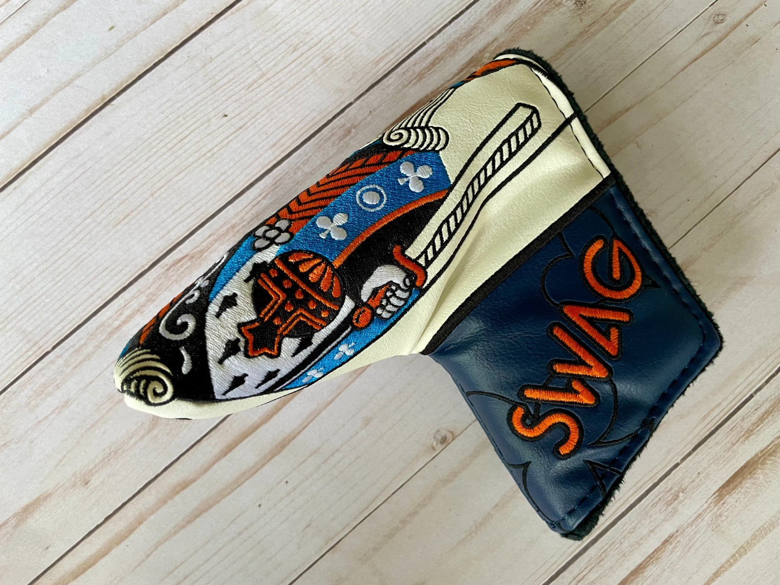 The *NEW* SWAG Golf NOOB McLaren King of Swag Blade Head Cover is a high-quality vinyl putter head cover designed for golf enthusiasts. Featuring a magnetic closure for easy installation and removal, this multicolor cover is perfect for showcasing your love for both golf and fashion. The NOOB model from SWAG Golf adds a unique touch to your golf equipment while protecting your club from scratches and damage. Upgrade your golf gear with this stylish and functional accessory.