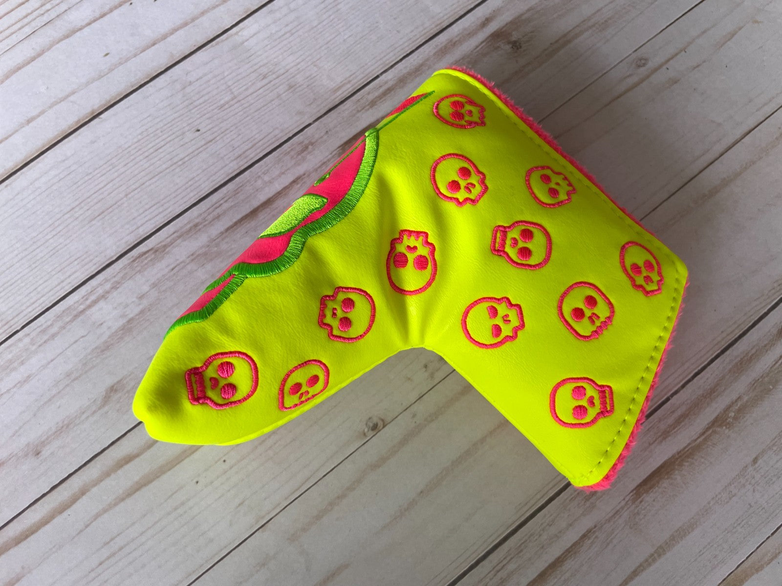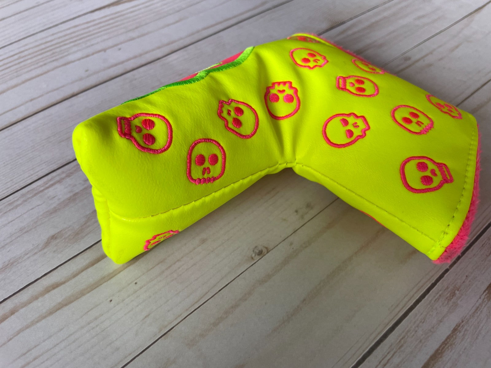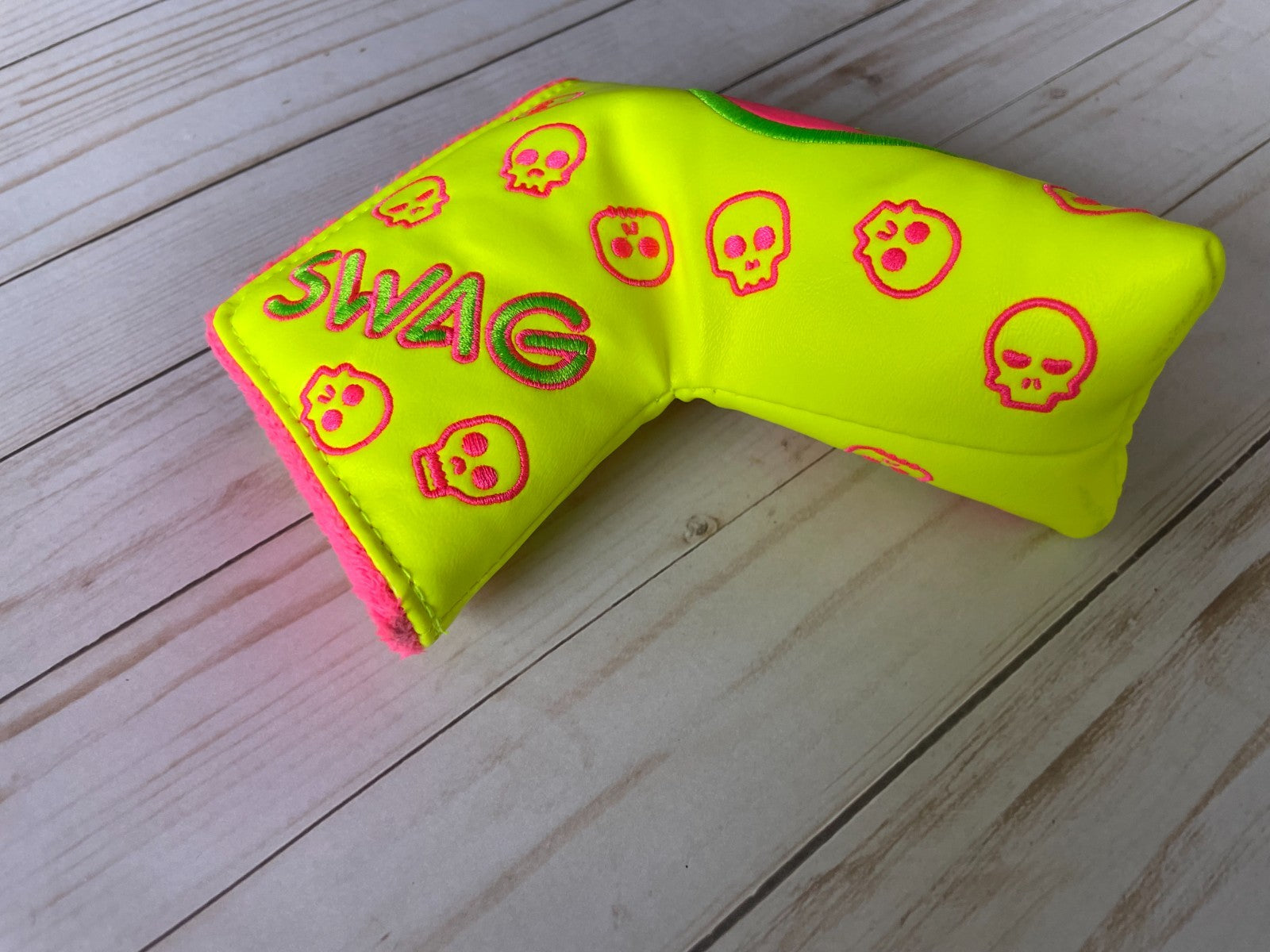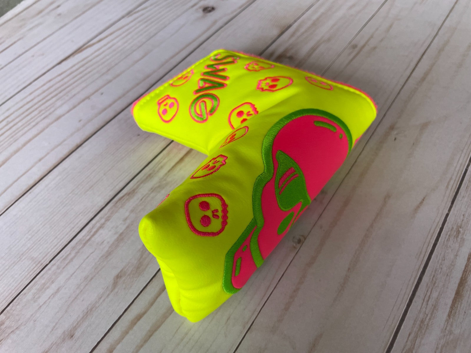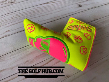 The SWAG Golf NOOB Swagenta Augusta Skull Blade Head Cover is a unique and stylish accessory for golf enthusiasts. Made of vinyl with a magnetic closure, this putter head cover features a striking yellow color and the signature SWAG Golf branding. Designed specifically for golf, this item adds a fun and personalized touch to any golfer's equipment. The NOOB model is a must-have for those looking to elevate their game on the course.